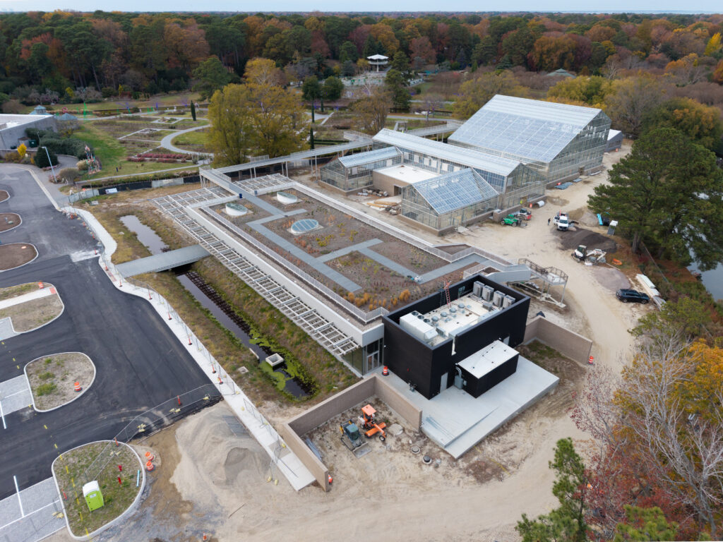 In preparation for The Garden of Tomorrow expansion, the current Baker Hall Visitor Center building officially became powered by the sun in December of 2022. Ryan Call, Director of Facilities at NBG, worked with Covert Solar to install a 212.400 kW system on the roof of the Baker Hall Visitor Center/Education Building. Comprised of 472 panels, this system is expected to offset 83% of that building’s energy needs. NBG is committed to being GREEN! The savings and environmental benefits are already working! In the first two months, NBG saved nearly $4,000 dollars and the solar panels have saved more than 80,000lbs of CO2 emissions, which is equivalent to over 600 trees that store carbon. This is the second solar panel installation at the Garden, the first was in 2018 when 120 panels were installed on the Dominion Energy Garden of Lights storage building.